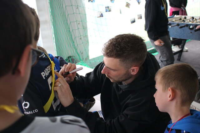 Weit mehr als 80 Kinder waren wieder dabei und freuten sich vor Beginn des Spiels erst einmal über eine Überraschung: Passend zum anstehenden Osterfest waren leckere Süßigkeiten versteckt, die schnell von den Kids gefunden und natürlich auch vernascht wurden. Außerdem besuchte SCP07-Profi Felix Platte die Kids, beantwortete Fragen und schrieb fleißig Autogramme.