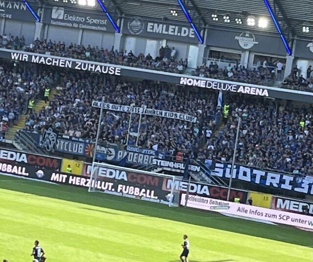 In diesem Jahr feiert der Kids Club seinen 15. Geburtstag und zum Start in die Jubiläumssaison gab´s den offiziellen Auftakt und rund 20 SCP07 Kids Club Mitglieder liefen mit selbstgemalten Bannern und Fahnen eine Stadionrunde und genossen den Applaus der Fans. Auch die Fanszene Paderborn grüßte mit einem Banner während des Spiels den Kids Club und gratulierte zum 15. Geburtstag.