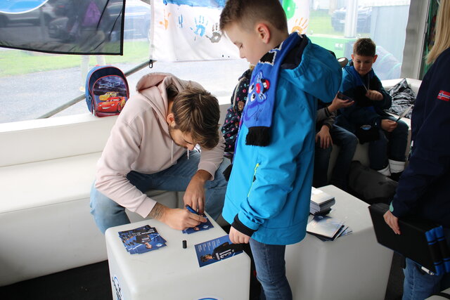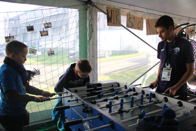 Vor dem Spiel war die Überraschung groß, denn Verteidiger Maximilian Rohr stattete den Jüngsten einen Besuch ab, stellte sich den neugierigen Fragen, schrieb fleißig Autogramme und auch das ein oder andere Selfie durfte nicht fehlen. Nach einer Runde an der Torwand und am Kicker, ging es endlich los.
